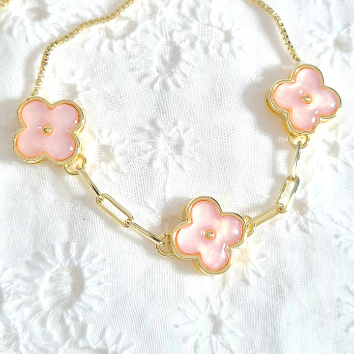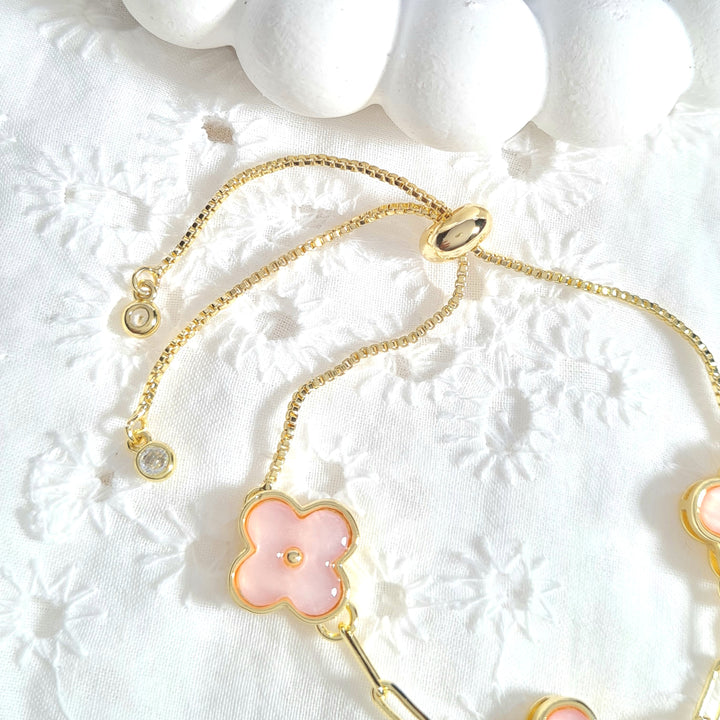 Pulsera rodio, sistema ajustable y dijes en forma de trébol rosa