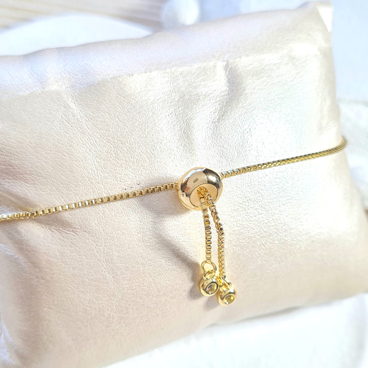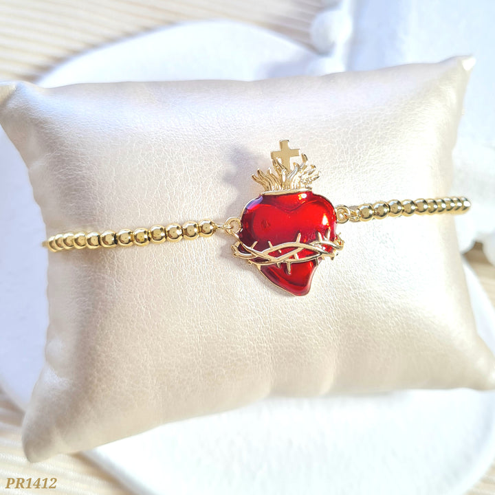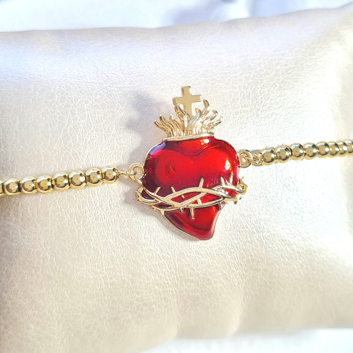 Pulsera en rodio, sistema ajustable con balines y dije en forma de sagrado corazón