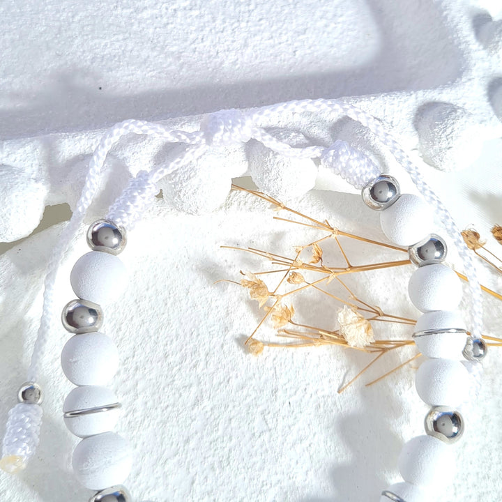 Pulsera tejida neopreno blanco y balines rodio plateados.