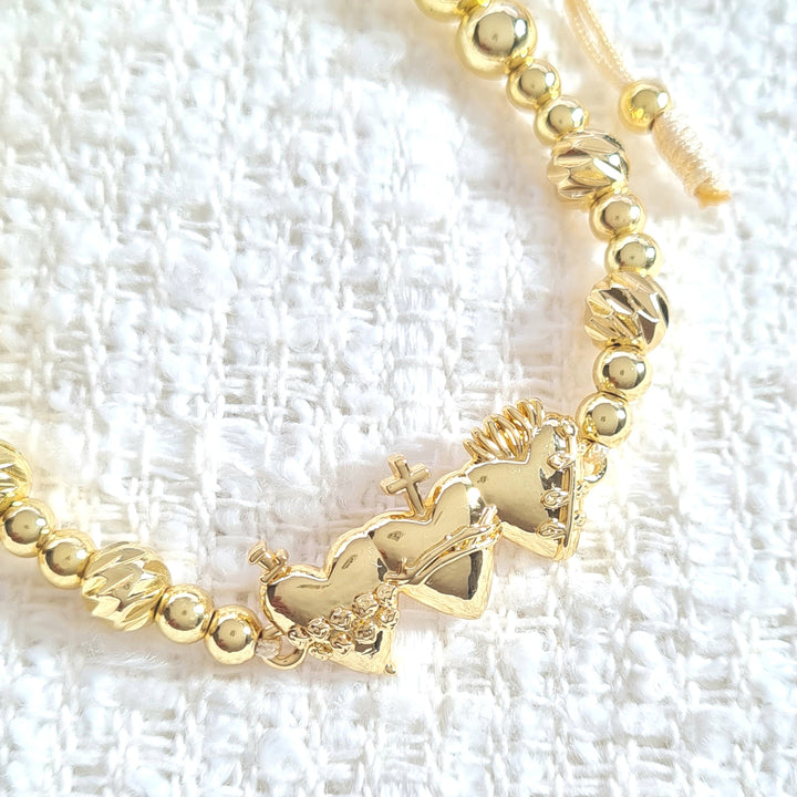 Pulsera tejida balines dorados con dije en forma de sagrado corazón