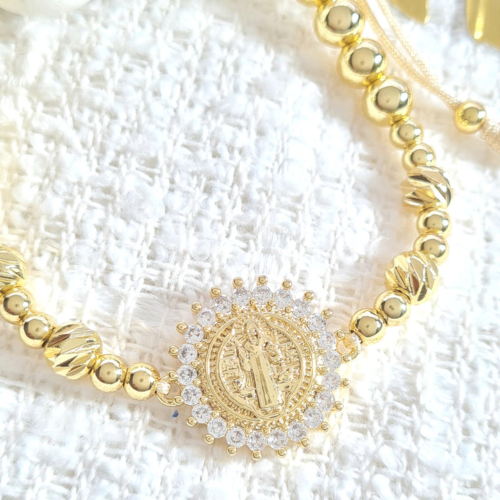 Pulsera tejida balines dorados con dije en forma de san Benito con zircones
