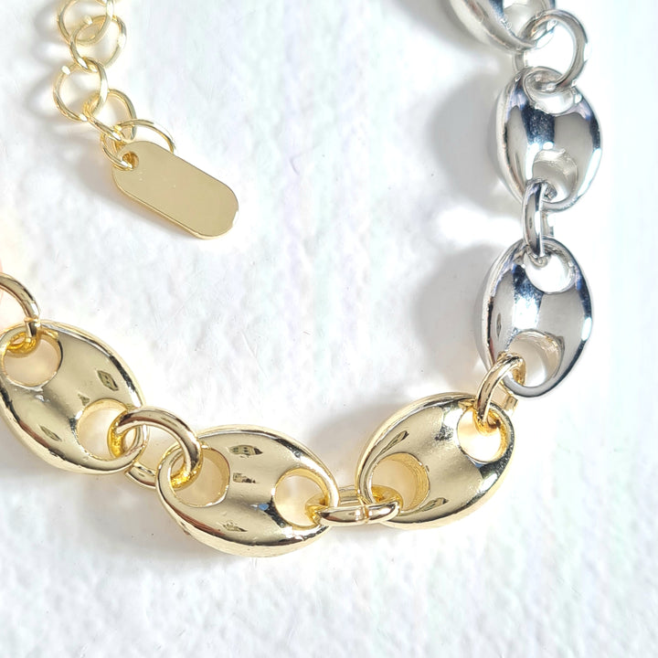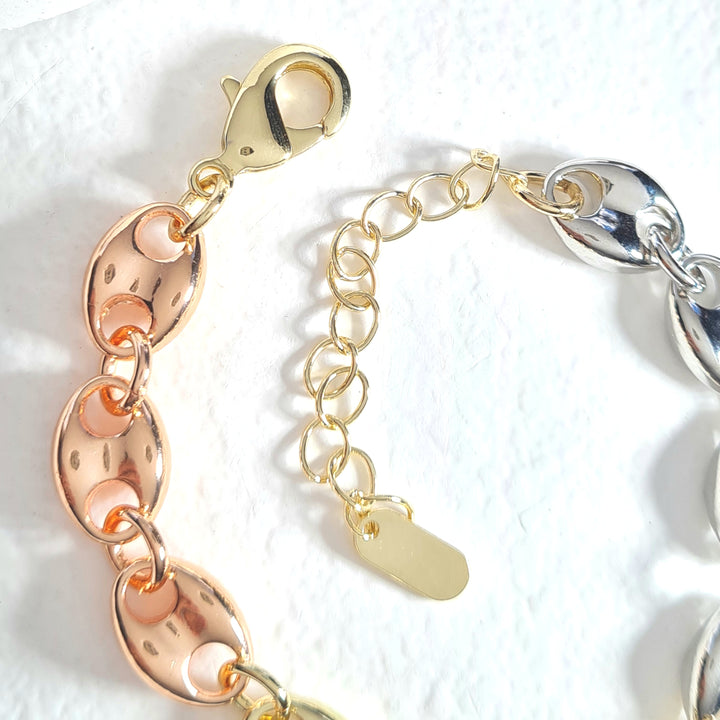 Pulsera en rodio, con tejido tipo Gucc1 en colores tres oros