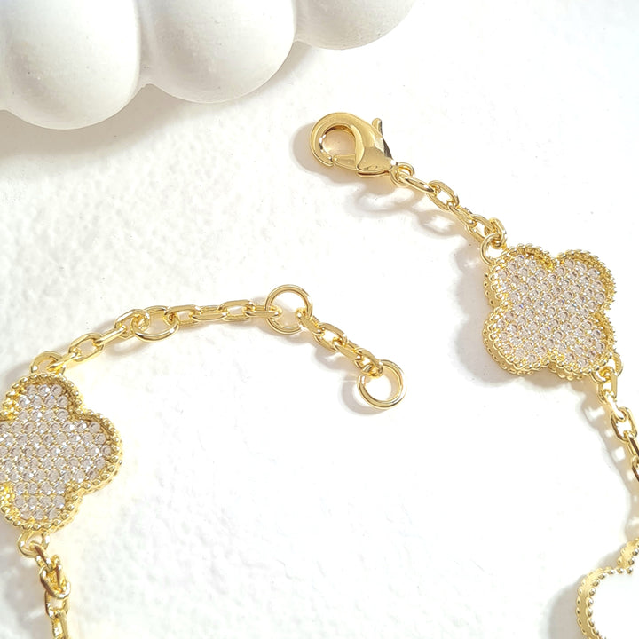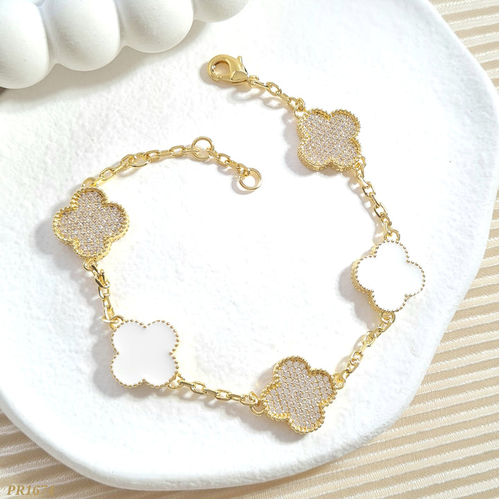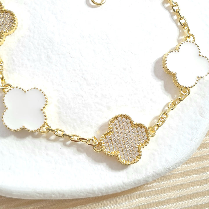 Pulsera rodio con dijes en forma de trébol color blanco y con detalles en zircones
