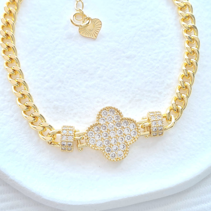 Pulsera rodio con dije en forma de trébol y detalles en zircones