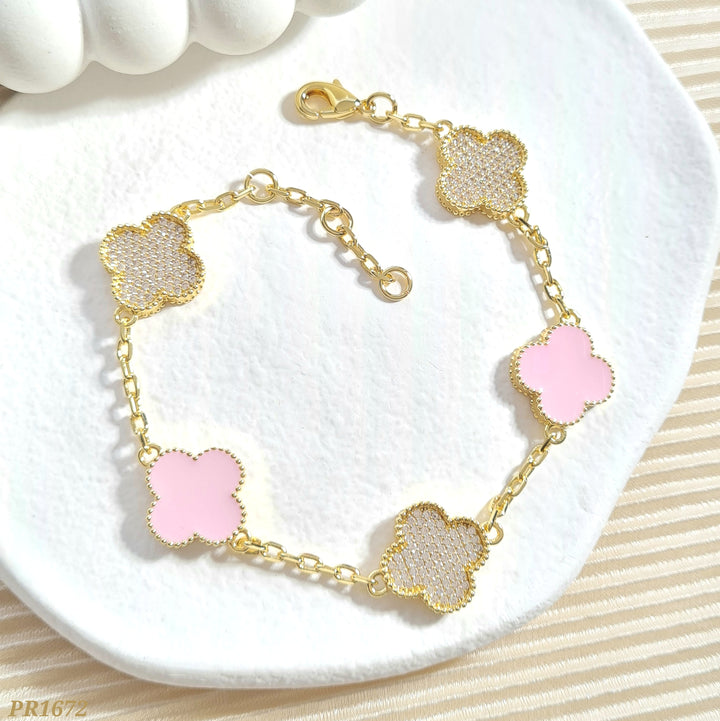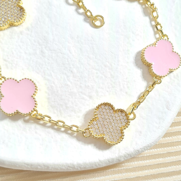 Pulsera rodio con dijes en forma de trébol color rosa y con detalles en zircones
