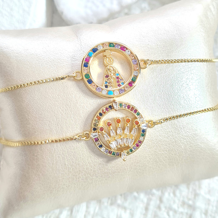 Pulsera en rodio con sistema ajustable, dije en forma de virgen y detalles en zircones