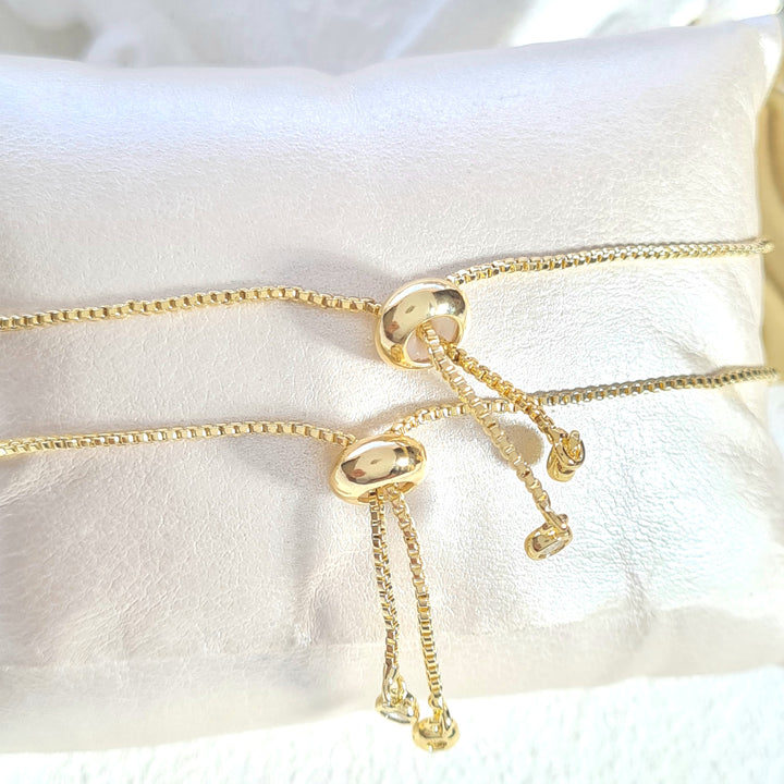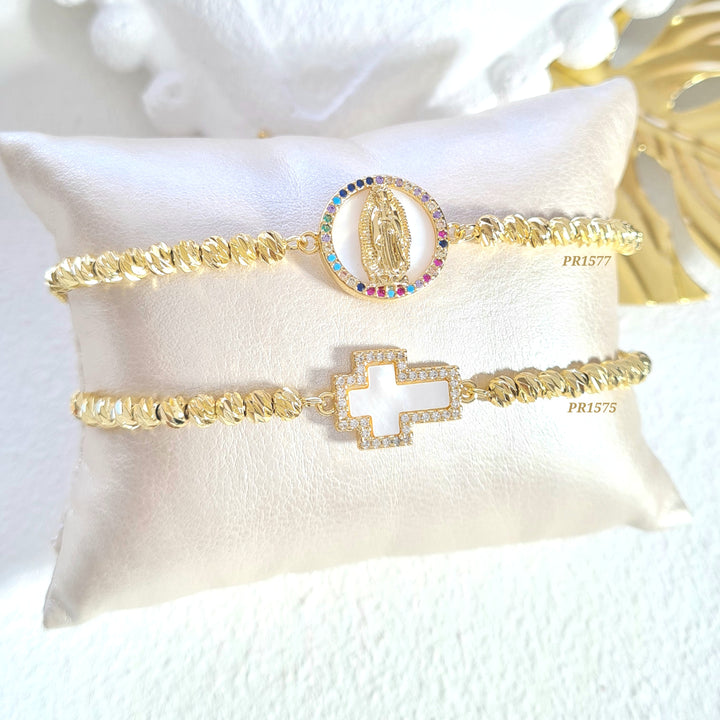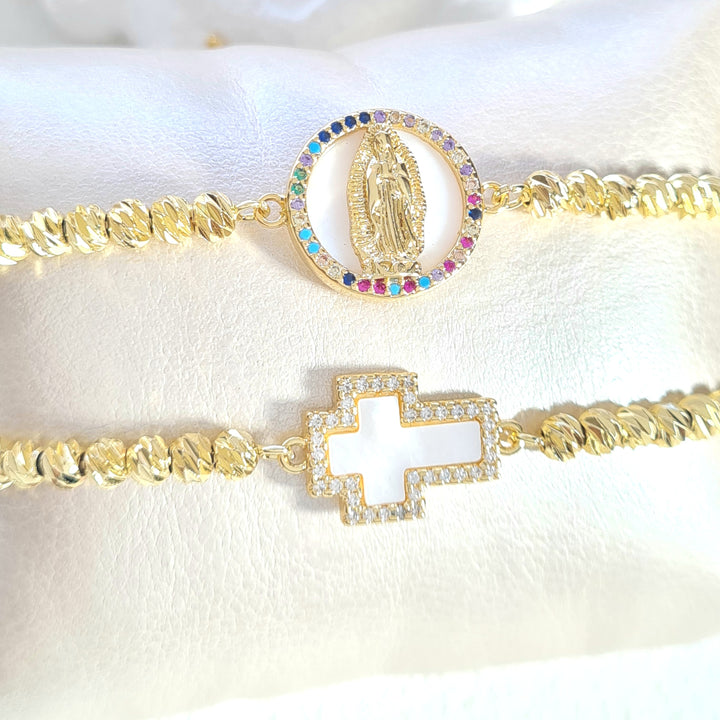 Pulsera en rodio con sistema ajustable y dije en forma de virgen con detalles en zircones