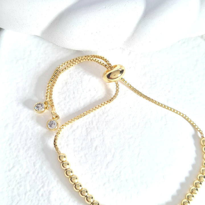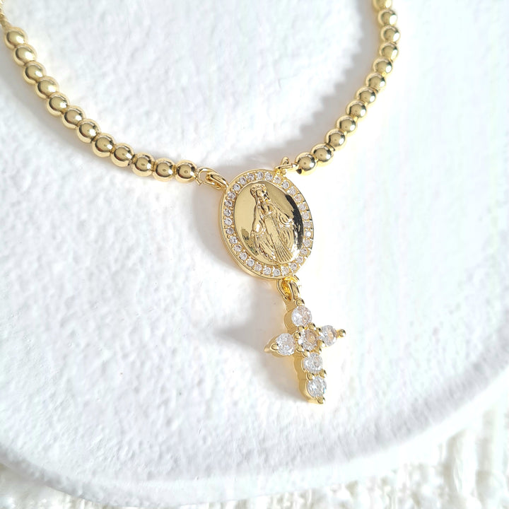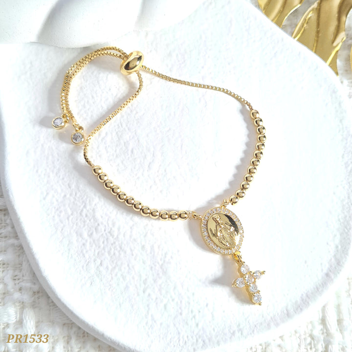 Pulsera en rodio, balines con dije en forma de virgen, cruz y detalles en zircones