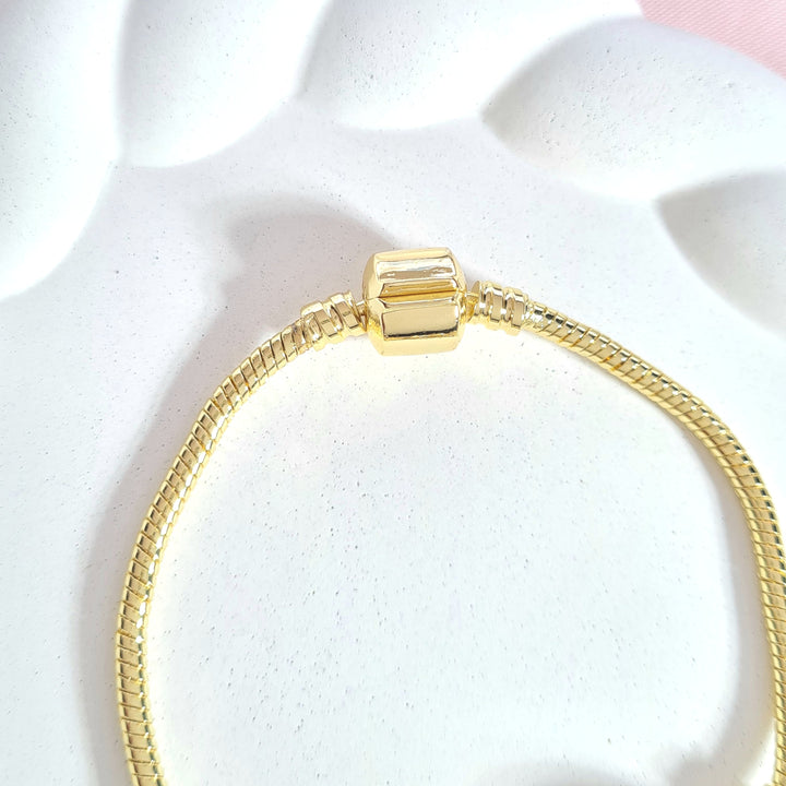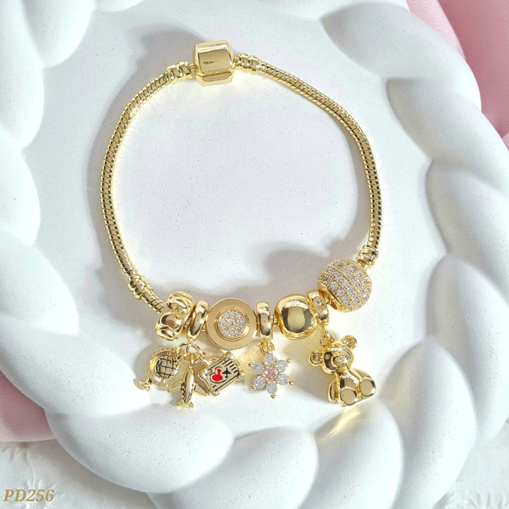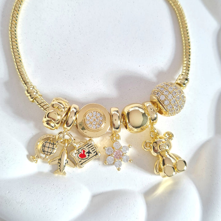 Pulso rodio con dijes avión, charm redondo, dije flor, charm redondo, dije oso, charm bola de fuego y detalles en zircones