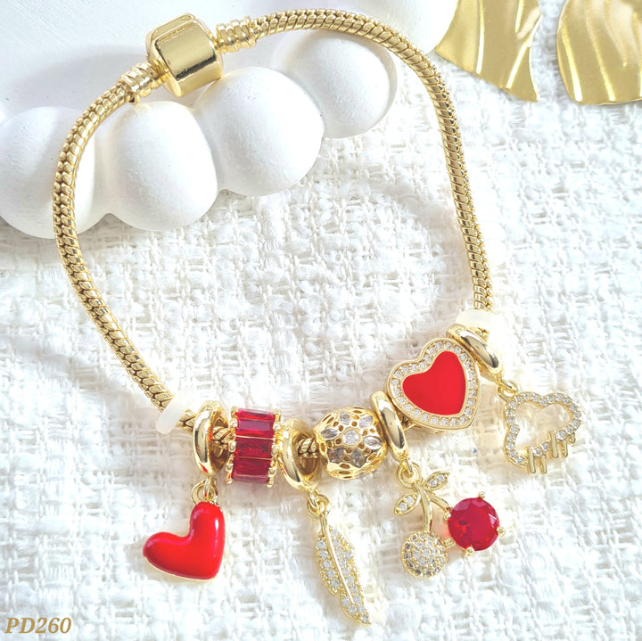 Pulso rodio con dijes corazón, charm rojo, dije pluma, charm redondo textura, dije cereza, charm corazón, dije nube con detalles en zircones