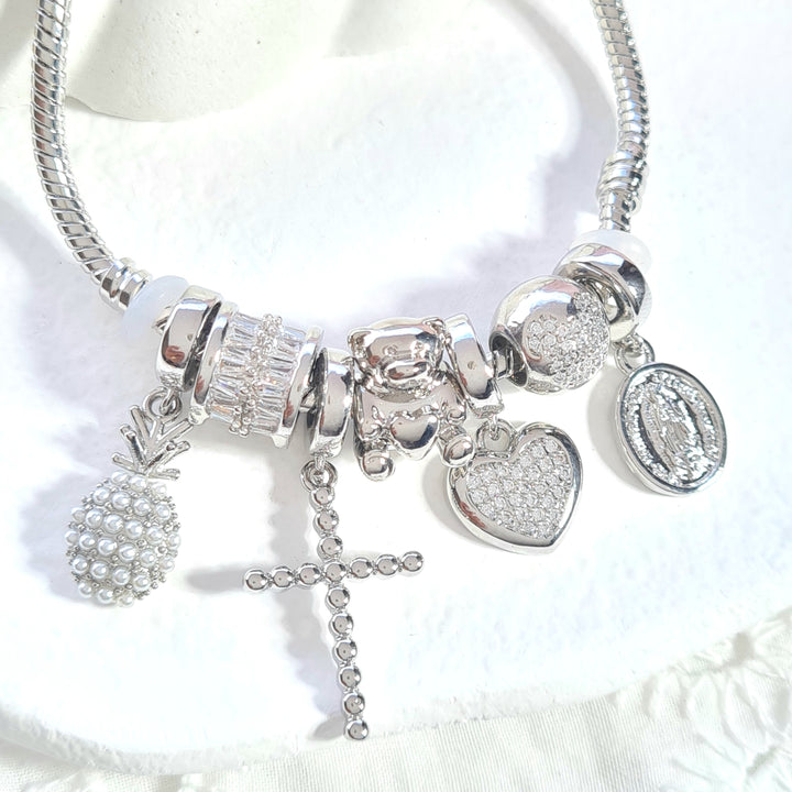 Pulso rodio plateado con dijes piña, charm redondo, dije cruz, charm oso, dije corazón, charm redondo y dije virgen con detalles en zircones