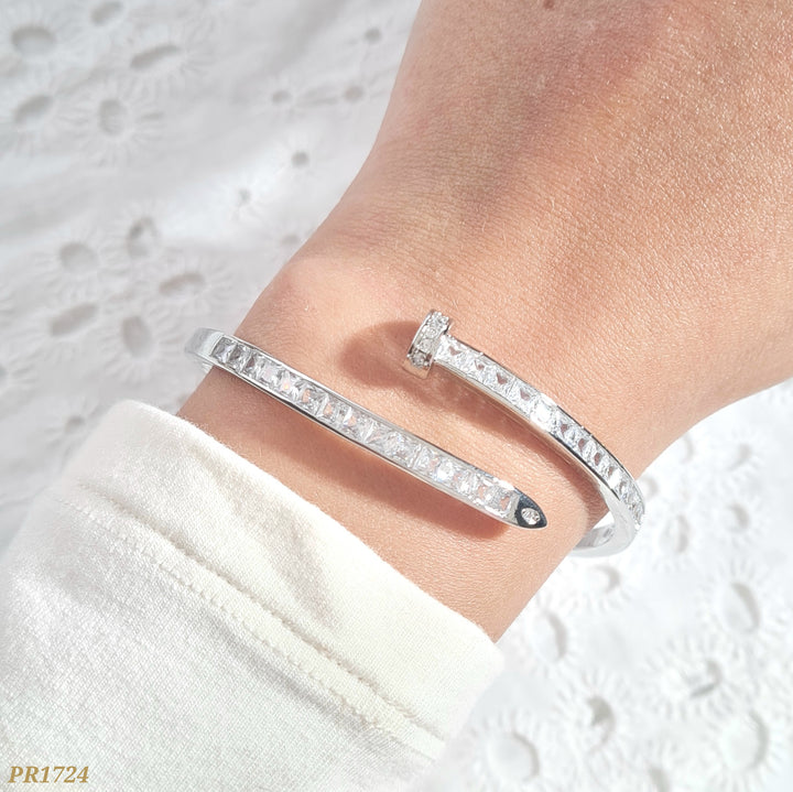 Pulso plateado en rodio con figura de clavo y detalles en zircones