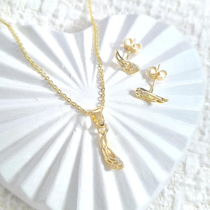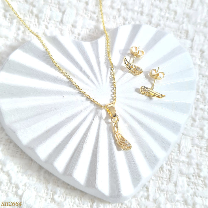 Set en rodio, con dije en forma de ala, detalles en zircones y topos a juego