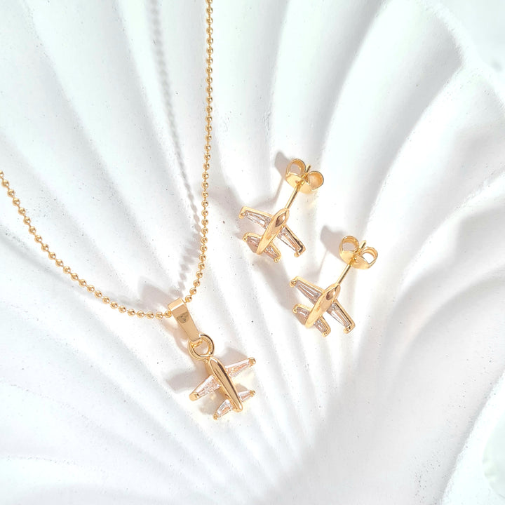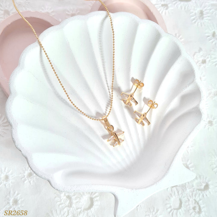 Set en rodio, cadena ajustable, dije en forma de avión mini con detalles en zircones y topos zircón