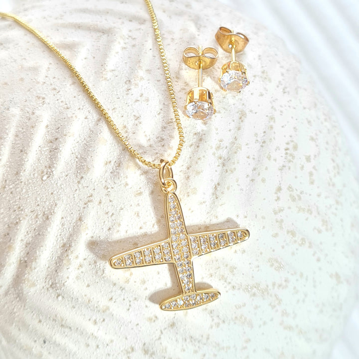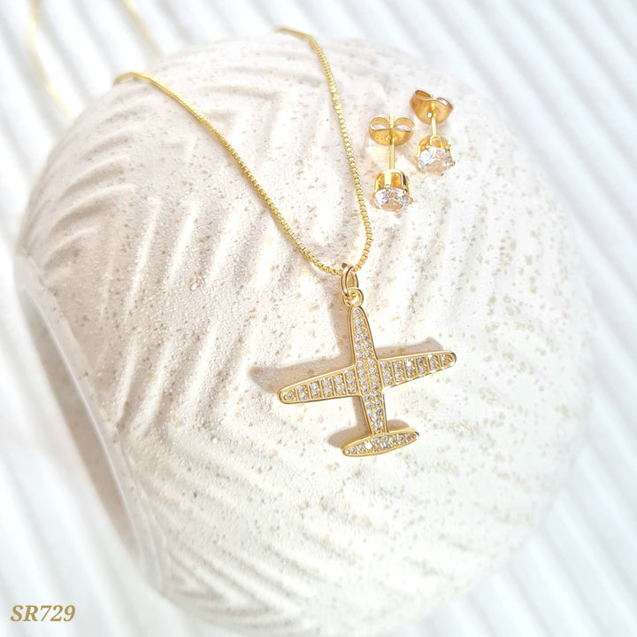 Set en rodio, cadena ajustable, dije en forma de avión con detalles en zircones y topos zircón