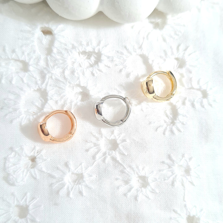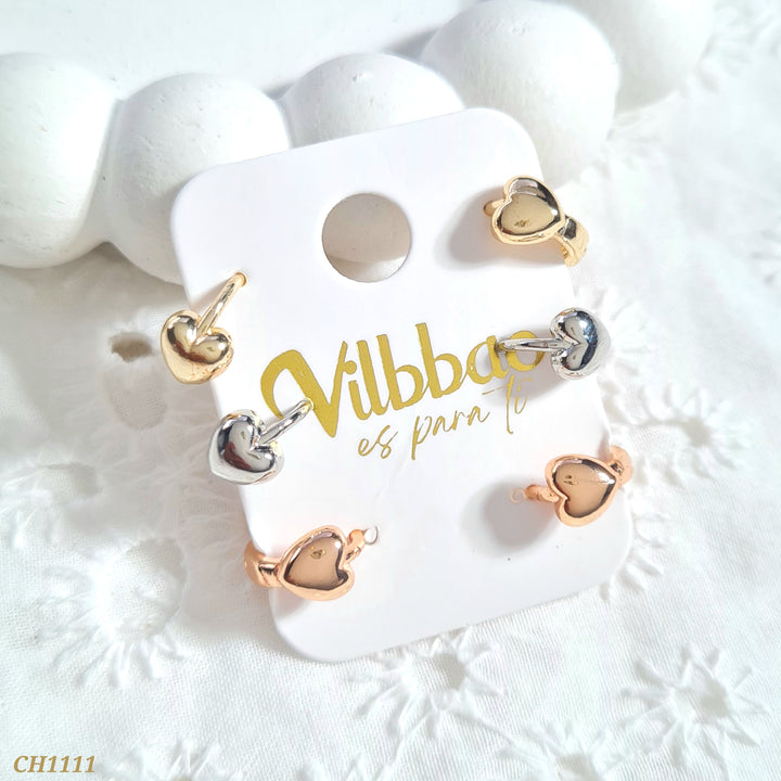 set en rodio con tres candongas con formas de corazón en colores tres oros