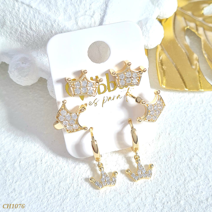 set en rodio con tres candongas con formas de coronas y detalles en zircones