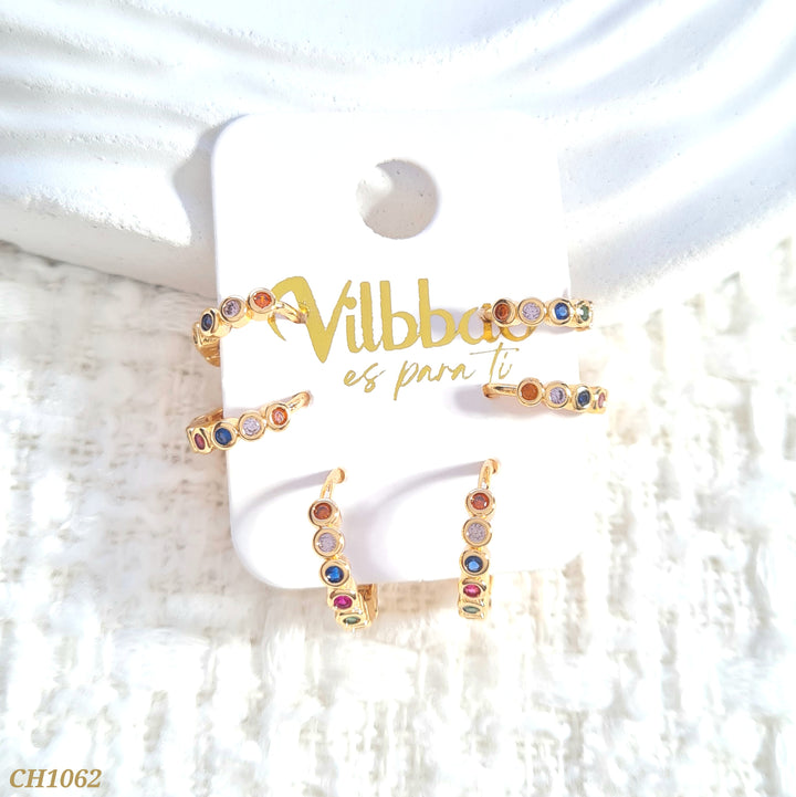 set en rodio con tres tamaños de candongas con zircones multicolor