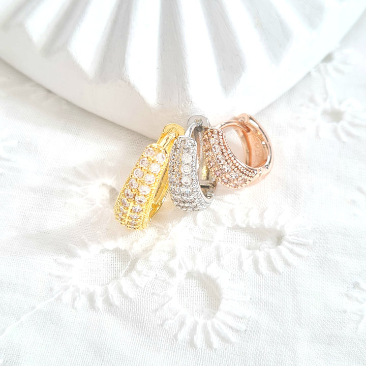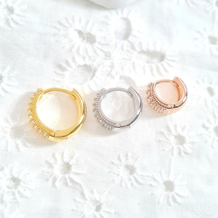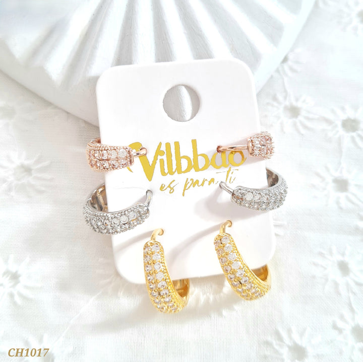 set en rodio con tres tamaños de candongas con detalles en zircones y colores tres oros