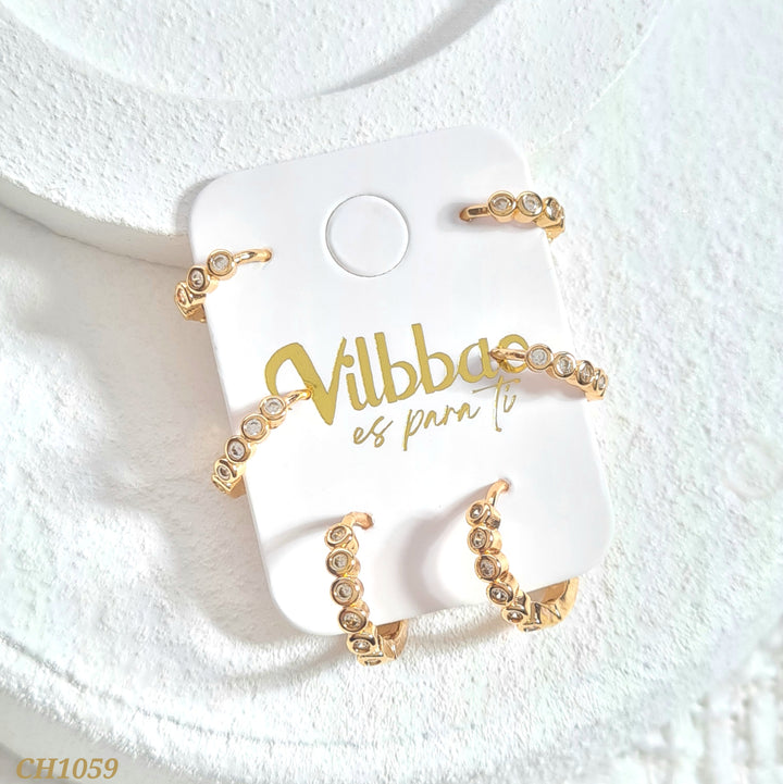 set en rodio con tres tamaños de candongas y detalles de zircones redondos