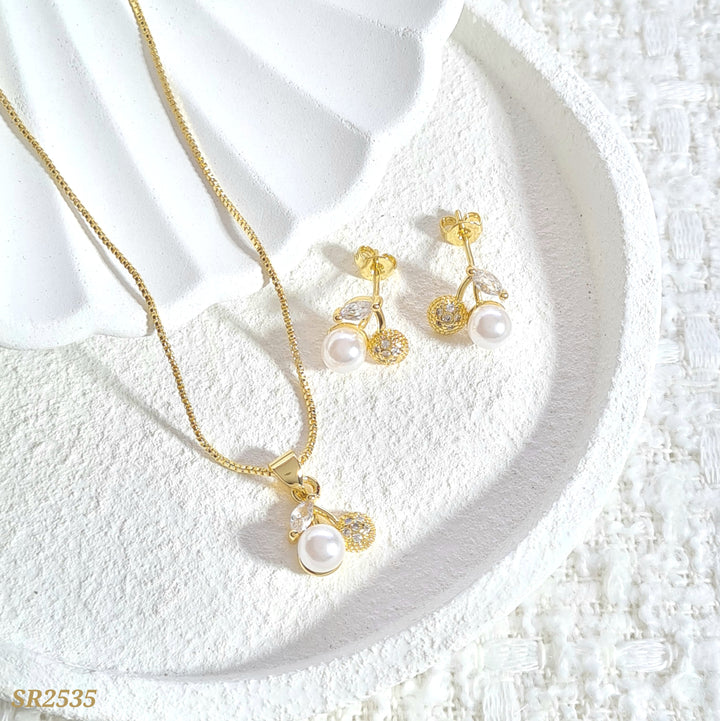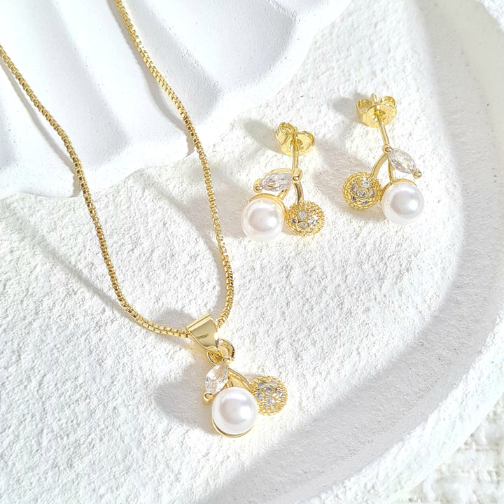 Set rodio, cadena ajustable, con dije en forma de cerezas, detalles en zircones y perlas con topos a juego