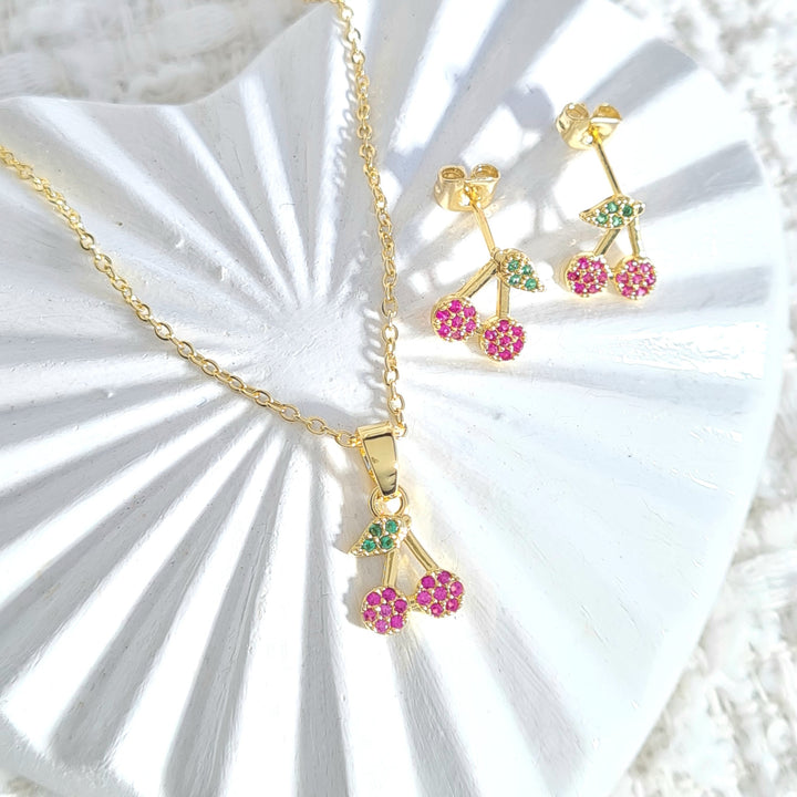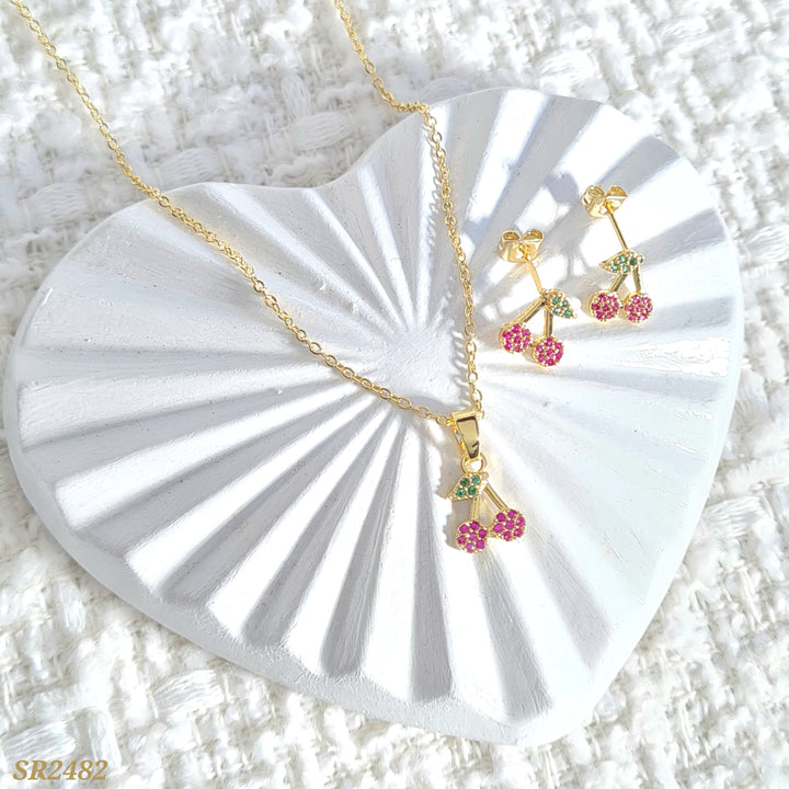 Set rodio con dije en forma de cerezas, detalles en zircones de colores y topos a juego