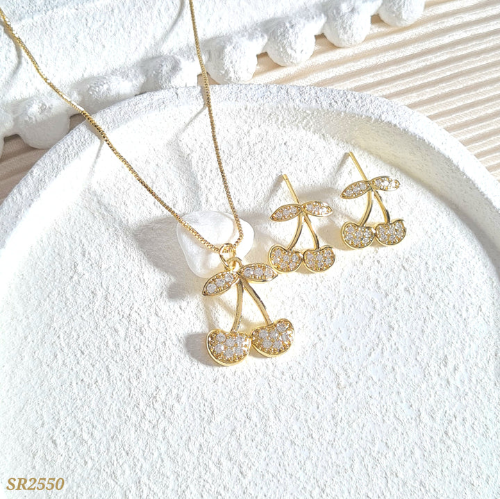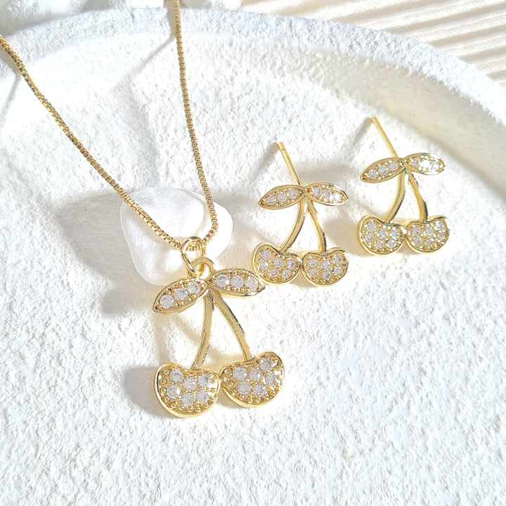 set en rodio con cadena ajustable y dijes de cerezas en zircones con topos a juego