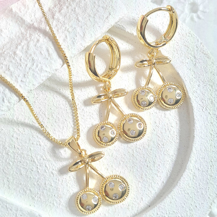 Set en rodio, cadena ajustable con dije de cerezas y topos a juego