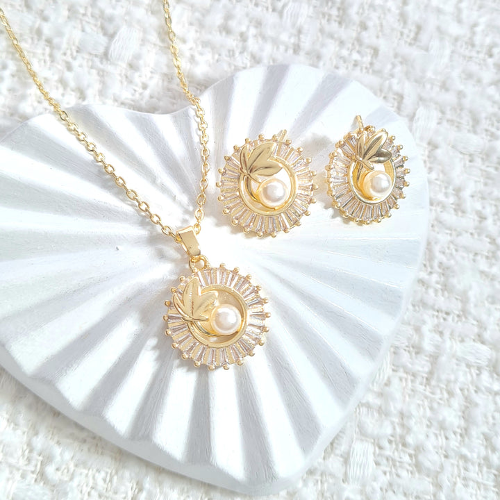 Set rodio dije circulo topos a juego con detalles en zircones y perla