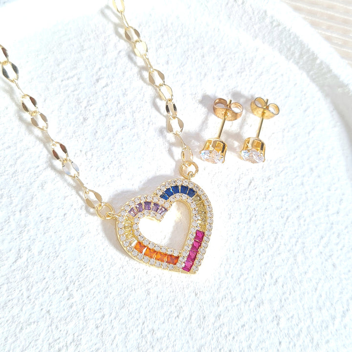 Set en rodio, dije en forma de corazón con zircones arcoíris y topos zircón