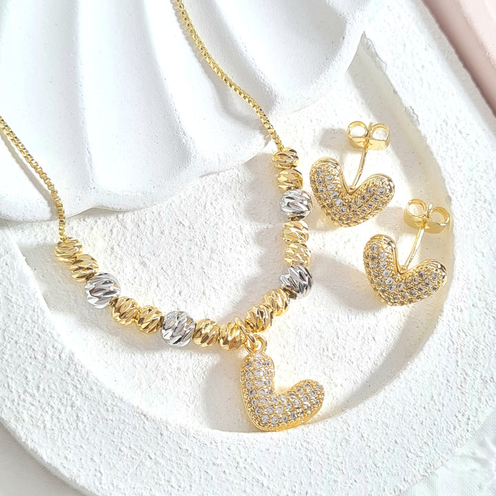 Set rodio, cadena ajustable, balines bicolor con dije en forma de corazón y topos a juego