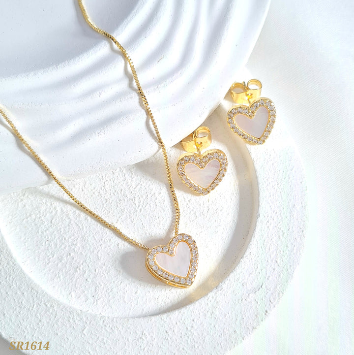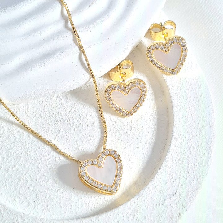 Set en rodio, cadena ajustable con dije en forma de corazón, con color blanco, zircones en borde y topos a juego
