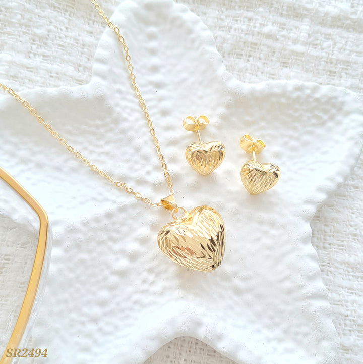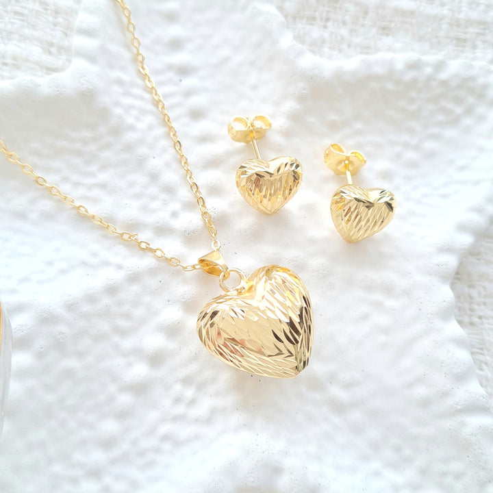 Set en rodio, dije en forma de corazón con textura diamantada y topos a juego