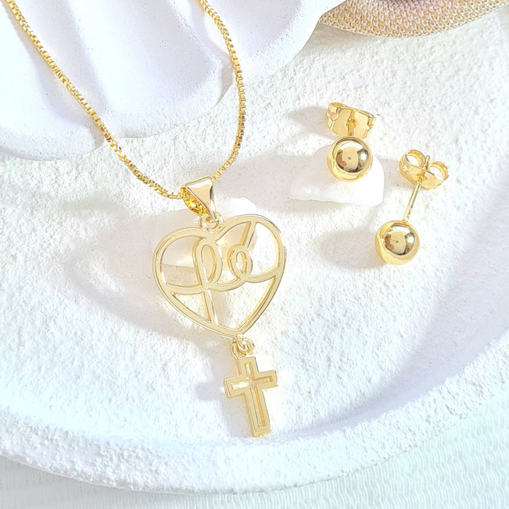 Set en rodio, dije en forma de corazón, palabra "Fe" en el centro, cruz y topos balín