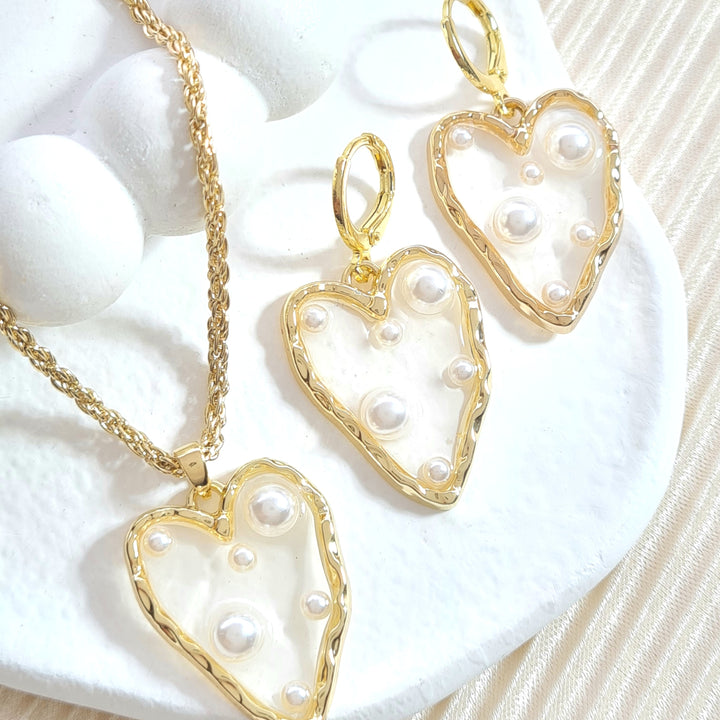 Set rodio, con dije en forma de corazón irregular, detalles en perlas y candongas a juego
