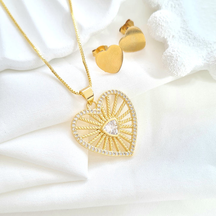 Set en rodio con cadena ajustable, dije en forma de corazón con líneas internas y zircón grande en el centro con topos a juego