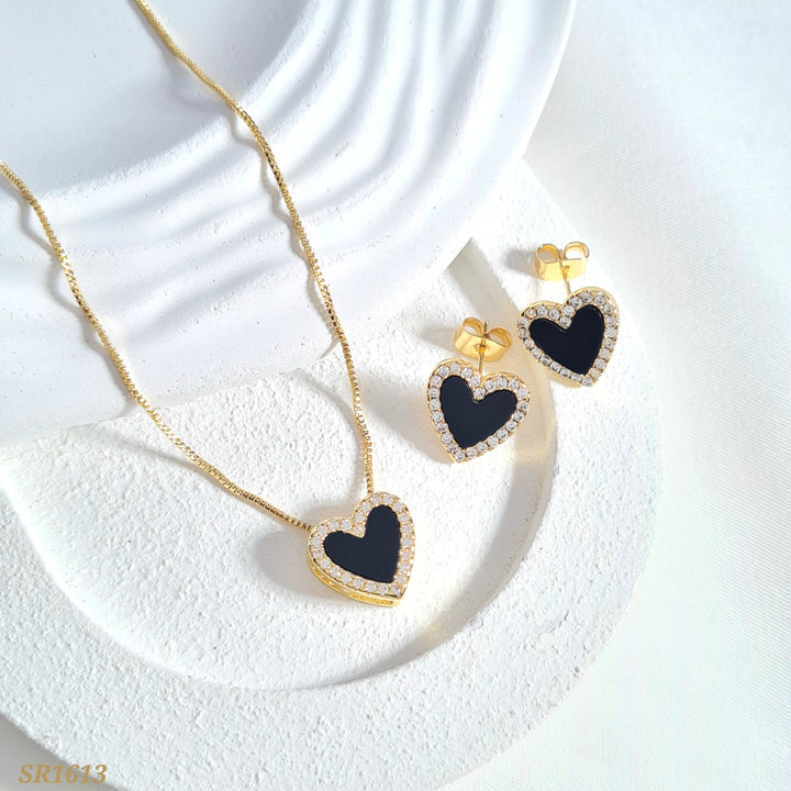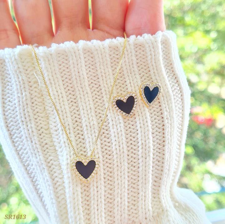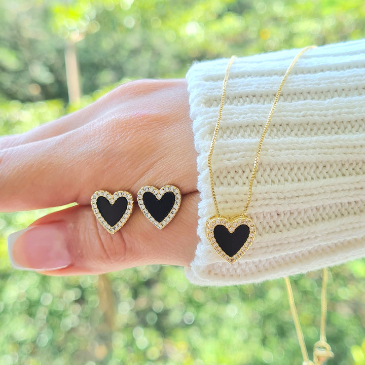 Set en rodio, cadena ajustable con dije en forma de corazón, con color negro , zircones en borde y topos a juego