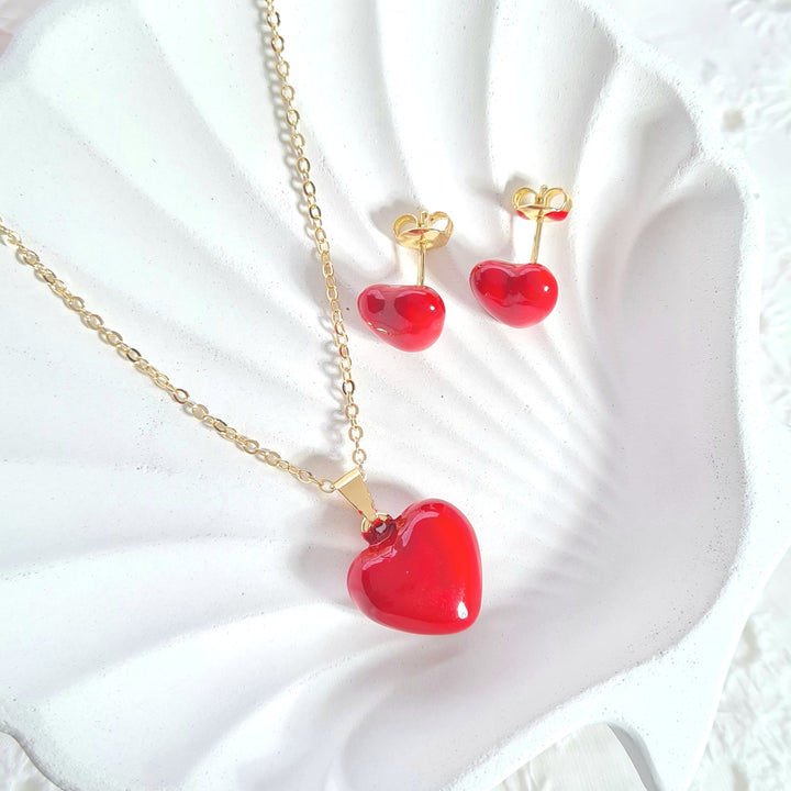 Set en rodio, dije en forma de corazón rojo y topos a juego