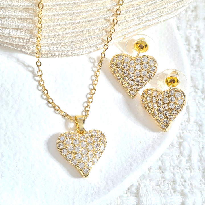 Set en rodio, dije con forma de corazón en zircones y topos a juego