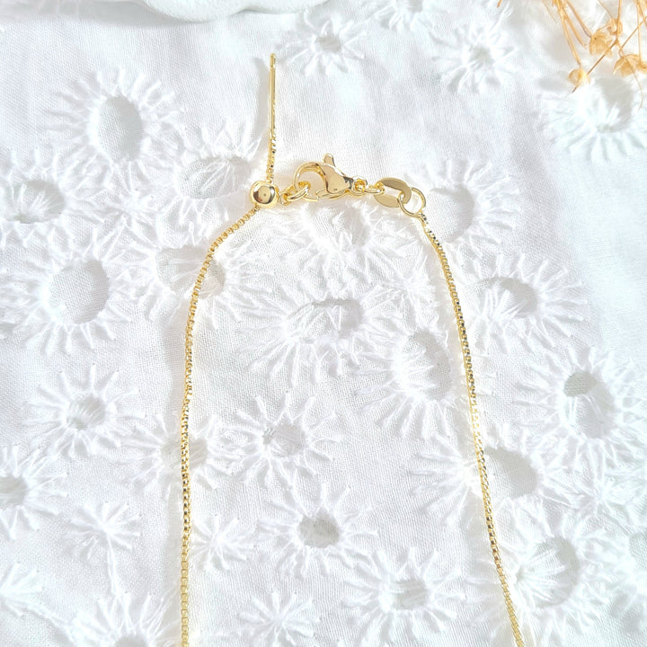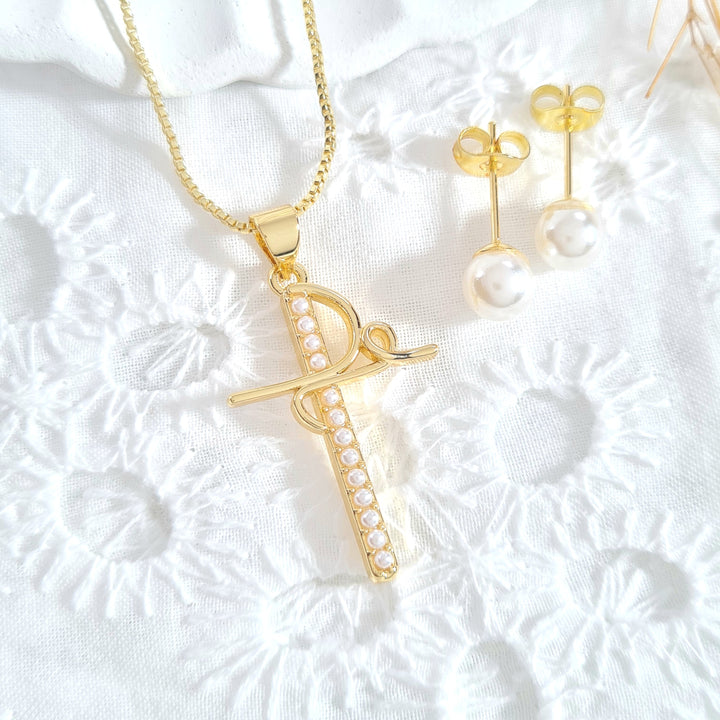 Set rodio, cadena ajustable, con dije en forma de cruz "fé" detalles en perla y topos perla