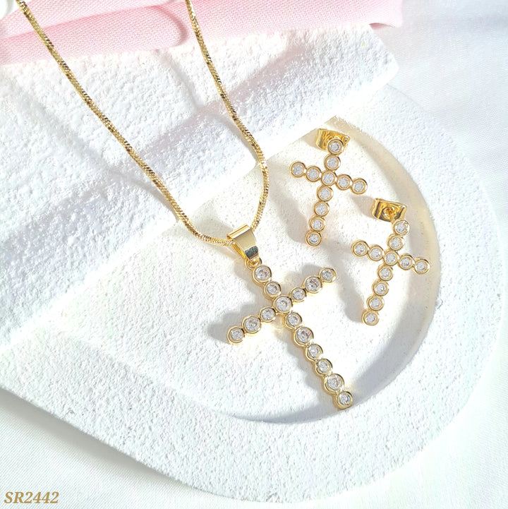 Set en rodio con dije en forma de cruz grande y topos a juego