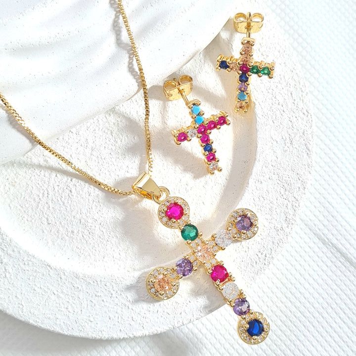 Set en rodio, cadena ajustable, dije en forma de cruz con zircones redondos multicolor y topos a juego