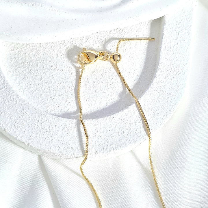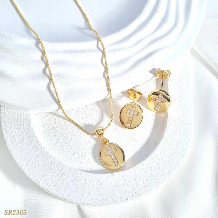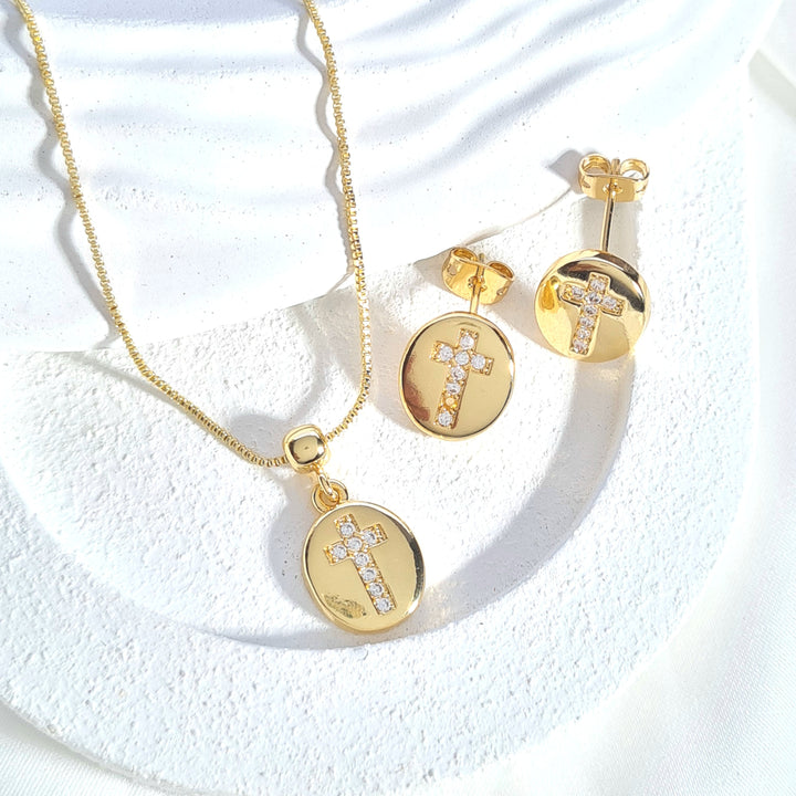 Set en rodio cadena ajustablecon dije en forma de cruz, detalles en zircones y topos a juego