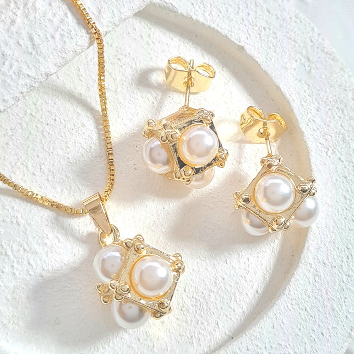 Set en rodio, dije en forma de dado con detalles en perlas y topos a juego