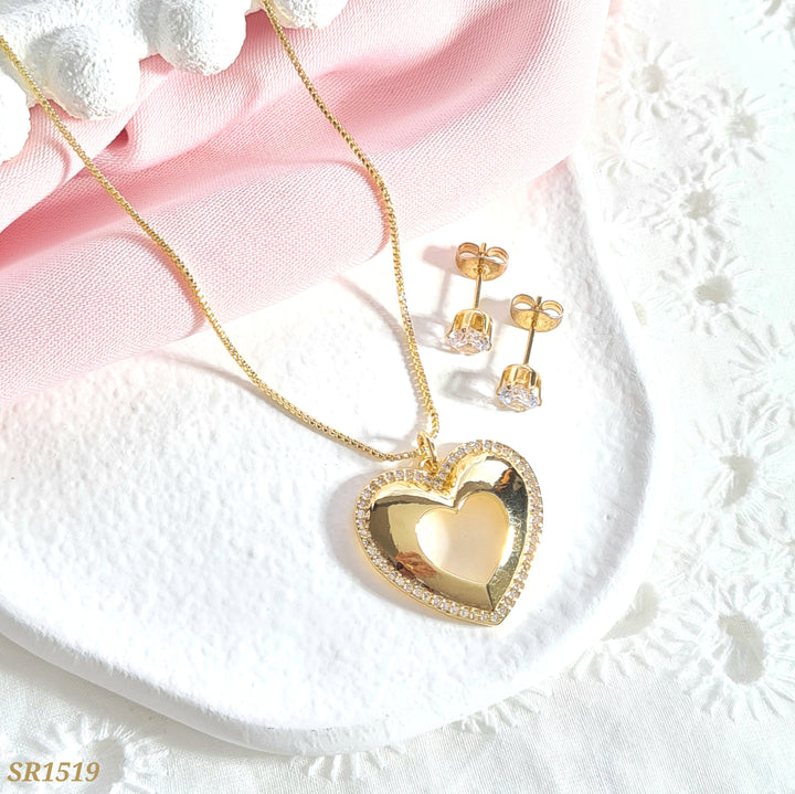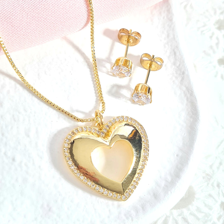 Set en rodio cadena ajustable, dije en forma de corazón, detalles zircón, silueta en el centro y topos zircón