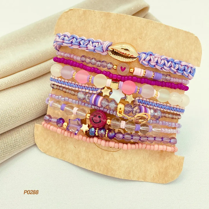 Set de pulseras en nailon con mostacilla en colores morados y fucsias, con cara feliz y detalle de concha en oro golfi