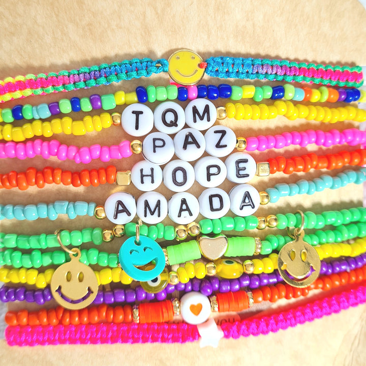 Set de pulseras en nailon e hilo con mostacilla en colores multiples , con detalles en oro golfi