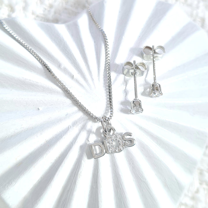 Set en rodio, cadena ajusable plateado dije en forma de palabra "Dios" y topos a juego
