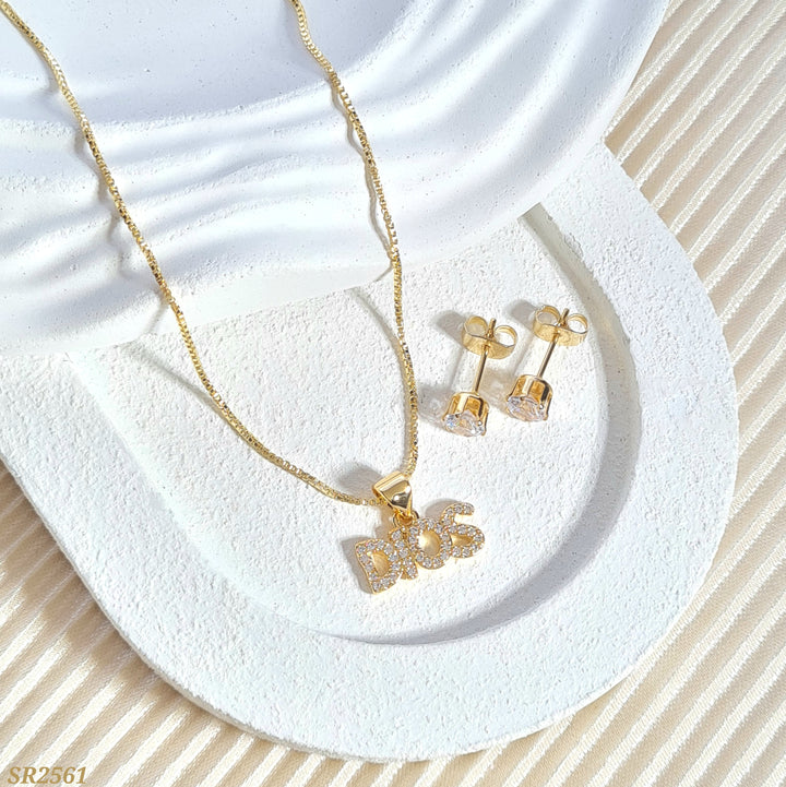 Set en rodio, cadena ajustable, dije en forma de palabra DIOS, detalles en zircones y topos zircón