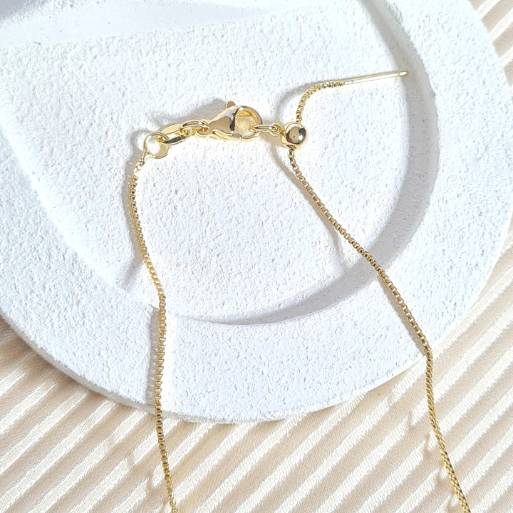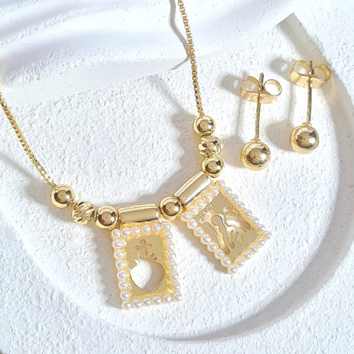 Set rodio, cadena ajustable, con dijes en forma de escapulario detalles en perla y topos zircón
